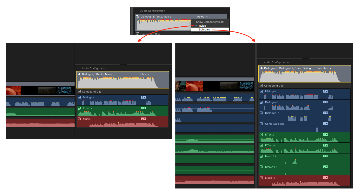 Confused yet? There’s more… Clips with multiple Subroles act differently too! Previously, if you added effects to multichannel (multi-subrole) clips – like a split mix, or production dialog with multiple mics – it would sum the output to single parent Roles.