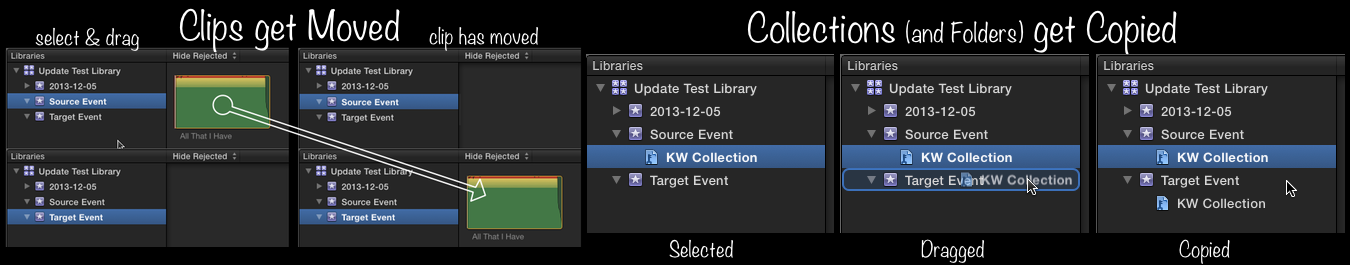 Events function more or less the same as before. You can make as many Events as you’d like in a Library. You can move clips/media, or copy/duplicate collections and other metadata between different Events within a Library.