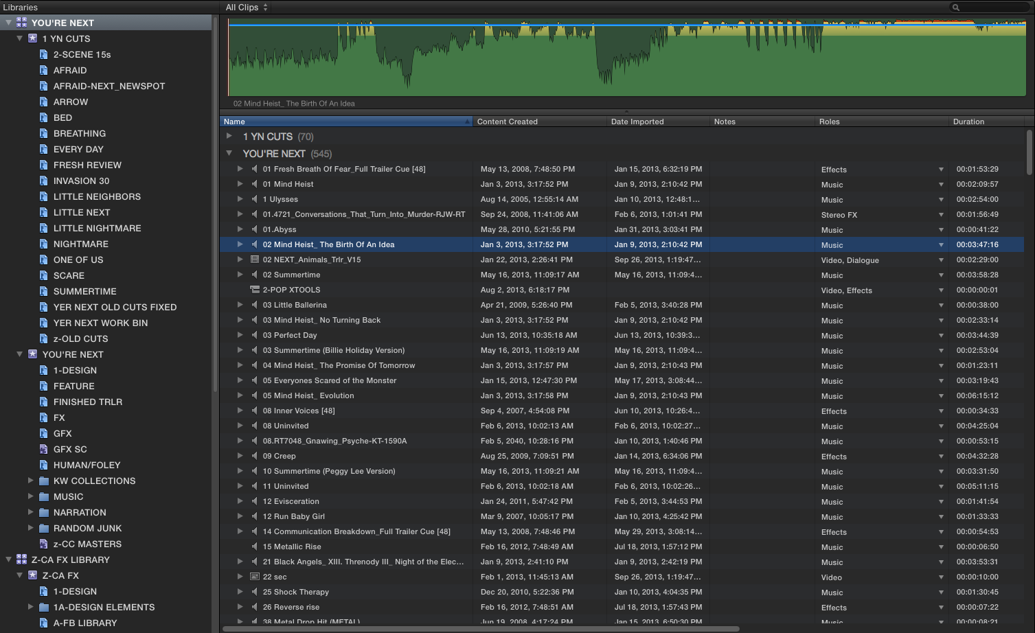 If that seems confusing, the picture on the left shows my Project and Event folders as they appear in the Finder. Only one “job” (ELYSIUM) is online, all other jobs are hidden (offline). My “jobs” can contain multiple Events and folders of Projects, but they’re all associated.